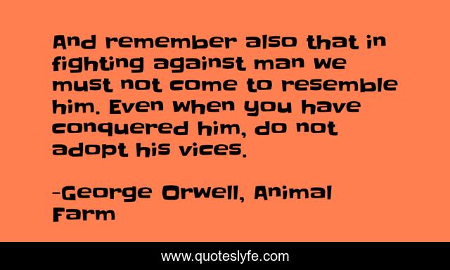 This page presents the quote "And remember also that in fighting against man we must not come to resemble him. Even when you have conquered him, do not adopt his vices.". Author of this quote is George Orwell, Animal Farm. This quote is about animal-farm, george-orwell, animal-equality, man,.