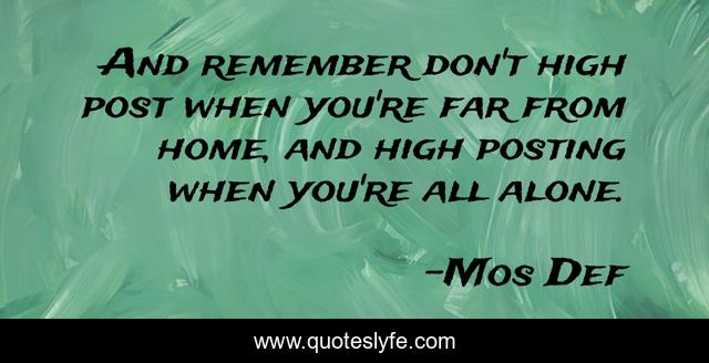This page presents the quote "And remember don't high post when you're far from home, and high posting when you're all alone.". Author of this quote is Mos Def. This quote is about alone, remember,.