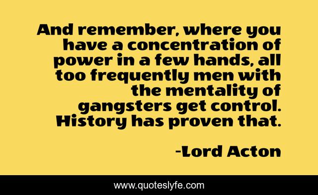 This page presents the quote "And remember, where you have a concentration of power in a few hands, all too frequently men with the mentality of gangsters get control. History has proven that.". Author of this quote is Lord Acton. This quote is about men, remember, power,.