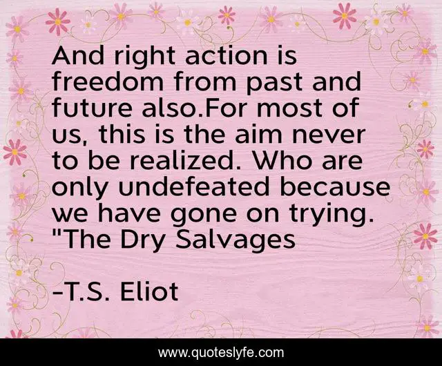 And right action is freedom from past and future also.For most of us, this is the aim never to be realized. Who are only undefeated because we have gone on trying. "The Dry Salvages