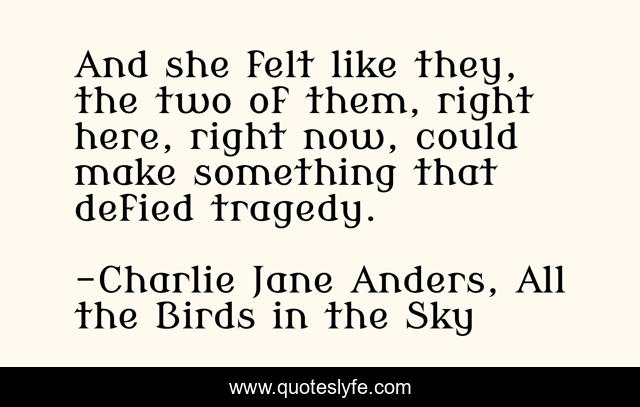 This page presents the quote "And she felt like they, the two of them, right here, right now, could make something that defied tragedy.". Author of this quote is Charlie Jane Anders, All the Birds in the Sky. This quote is about love, tragedy, affection,.