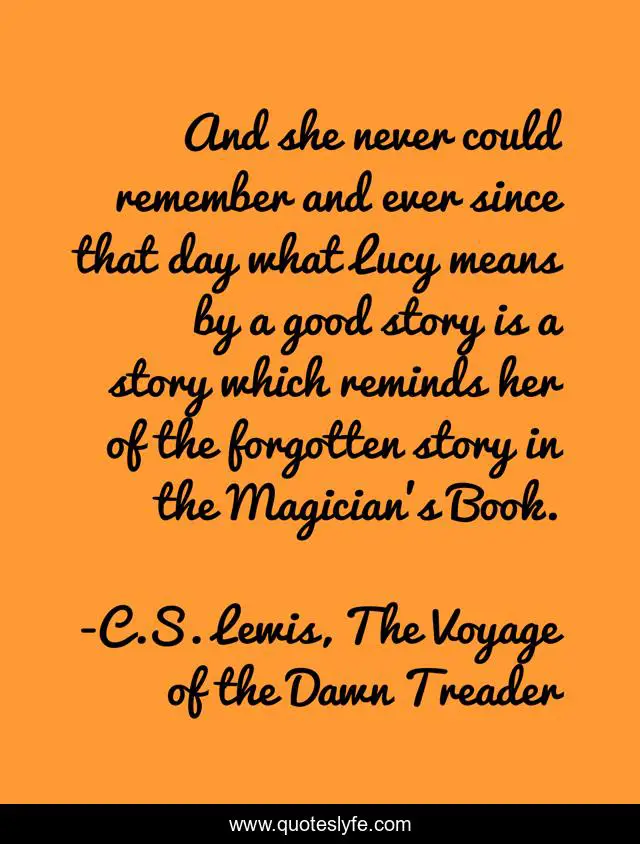 This page presents the quote "And she never could remember and ever since that day what Lucy means by a good story is a story which reminds her of the forgotten story in the Magician's Book.". Author of this quote is C.S. Lewis, The Voyage of the Dawn Treader. This quote is about books, magic,.