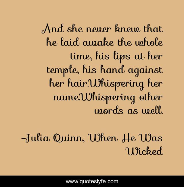 This page presents the quote "And she never knew that he laid awake the whole time, his lips at her temple, his hand against her hair.Whispering her name.Whispering other words as well.". Author of this quote is Julia Quinn, When He Was Wicked. This quote is about michael-stirling, love, unrequited-love, affection,.