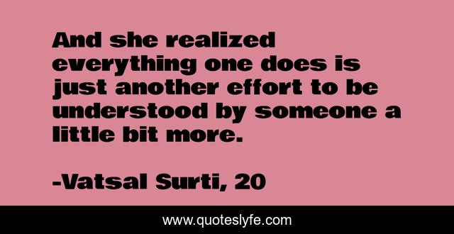This page presents the quote "And she realized everything one does is just another effort to be understood by someone a little bit more.". Author of this quote is Vatsal Surti, 20. This quote is about relationships, loneliness, love, affection,.