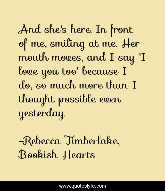 This page presents the quote "And she's here. In front of me, smiling at me. Her mouth moves, and I say 'I love you too' because I do, so much more than I thought possible even yesterday.". Author of this quote is Rebecca Timberlake, Bookish Hearts. This quote is about romance, love, romantic, affection,.