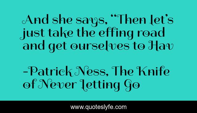 This page presents the quote "And she says, “Then let’s just take the effing road and get ourselves to Hav". Author of this quote is Patrick Ness, The Knife of Never Letting Go. This quote is about funny, comedy, effing, viola, todd,.