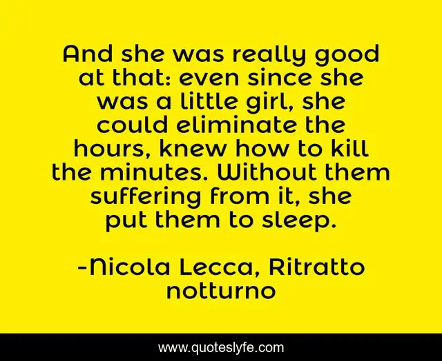 This page presents the quote "And she was really good at that: even since she was a little girl, she could eliminate the hours, knew how to kill the minutes. Without them suffering from it, she put them to sleep.". Author of this quote is Nicola Lecca, Ritratto notturno. This quote is about killing-time, dreaming,.