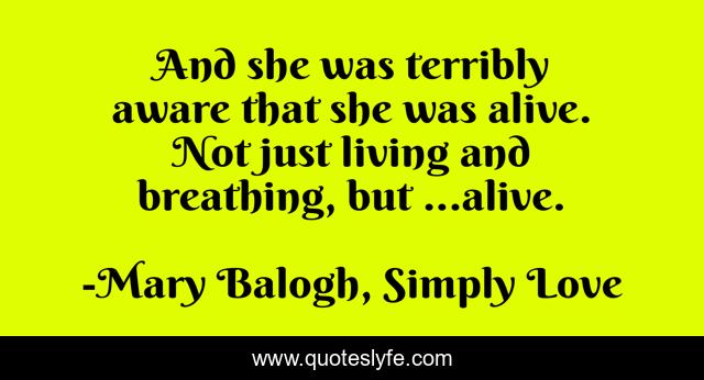 This page presents the quote "And she was terribly aware that she was alive. Not just living and breathing, but ...alive.". Author of this quote is Mary Balogh, Simply Love. This quote is about breath, live, alive,.