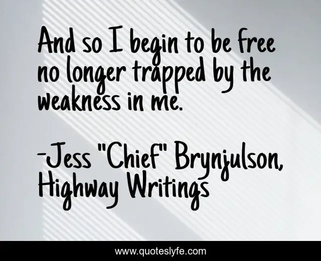 This page presents the quote "And so I begin to be free no longer trapped by the weakness in me.". Author of this quote is Jess "Chief" Brynjulson, Highway Writings. This quote is about weakness, free, trapped,.