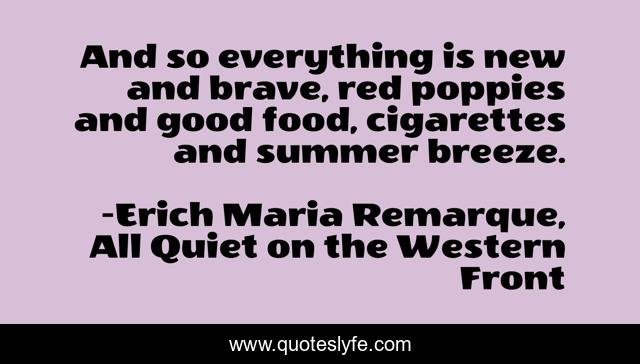 This page presents the quote "And so everything is new and brave, red poppies and good food, cigarettes and summer breeze.". Author of this quote is Erich Maria Remarque, All Quiet on the Western Front. This quote is about smooth, words,.