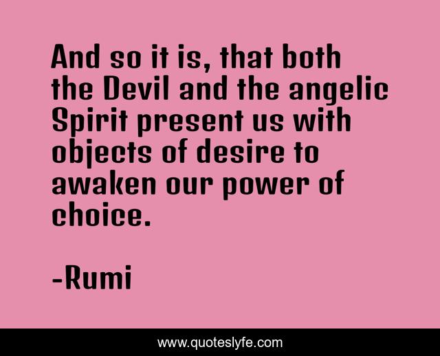 This page presents the quote "And so it is, that both the Devil and the angelic Spirit present us with objects of desire to awaken our power of choice.". Author of this quote is Rumi. This quote is about devil, present, choice,.