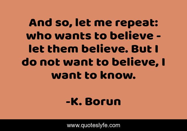 This page presents the quote "And so, let me repeat: who wants to believe - let them believe. But I do not want to believe, I want to know.". Author of this quote is K. Borun. .