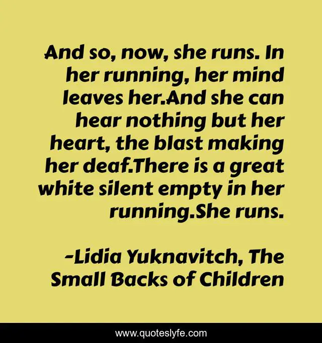 This page presents the quote "And so, now, she runs. In her running, her mind leaves her.And she can hear nothing but her heart, the blast making her deaf.There is a great white silent empty in her running.She runs.". Author of this quote is Lidia Yuknavitch, The Small Backs of Children. .