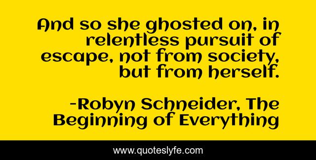 This page presents the quote "And so she ghosted on, in relentless pursuit of escape, not from society, but from herself.". Author of this quote is Robyn Schneider, The Beginning of Everything. .