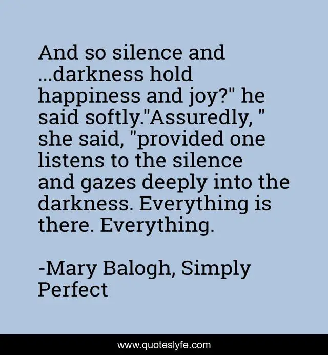 "Mary Balogh, Simply Perfect Quotes." Quoteslyfe.com, 2025. Fri. 05 Dec. 2025. <https://www.quoteslyfe.com/quote/And-so-silence-and-darkness-hold-happiness-96931>.