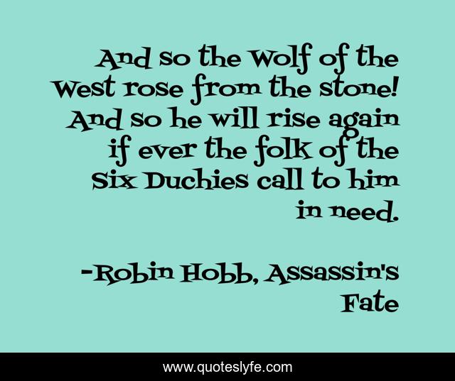 This page presents the quote "And so the Wolf of the West rose from the stone! And so he will rise again if ever the folk of the Six Duchies call to him in need.". Author of this quote is Robin Hobb, Assassin's Fate. This quote is about fool, song, hunt, wolf-of-the-west, fitz, nighteyes, hap,.