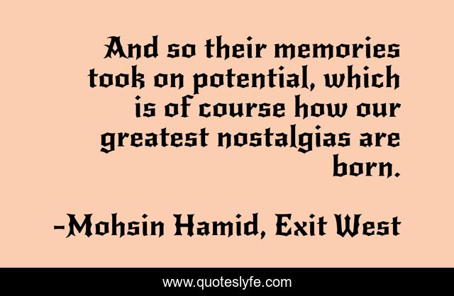 This page presents the quote "And so their memories took on potential, which is of course how our greatest nostalgias are born.". Author of this quote is Mohsin Hamid, Exit West. This quote is about nostalgia, memory,.