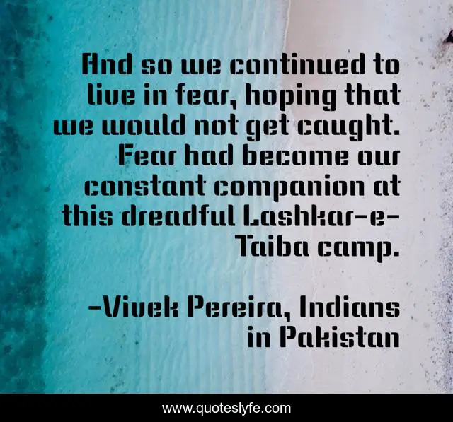 This page presents the quote "And so we continued to live in fear, hoping that we would not get caught. Fear had become our constant companion at this dreadful Lashkar-e-Taiba camp.". Author of this quote is Vivek Pereira, Indians in Pakistan. This quote is about indians-in-pakistan, action-adventure, action-thriller, novel, fiction, book, action, fear, film-dialogues,.