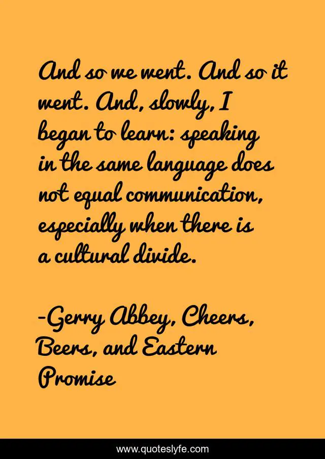 This page presents the quote "And so we went. And so it went. And, slowly, I began to learn: speaking in the same language does not equal communication, especially when there is a cultural divide.". Author of this quote is Gerry Abbey, Cheers, Beers, and Eastern Promise. This quote is about chinese, language, southeast-asia, travel, travel-writing, asia, teachers, english, teaching,.