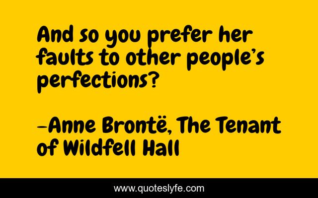 This page presents the quote "And so you prefer her faults to other people’s perfections?". Author of this quote is Anne Brontë, The Tenant of Wildfell Hall. This quote is about fault, love, imperfections, affection, perfection,.