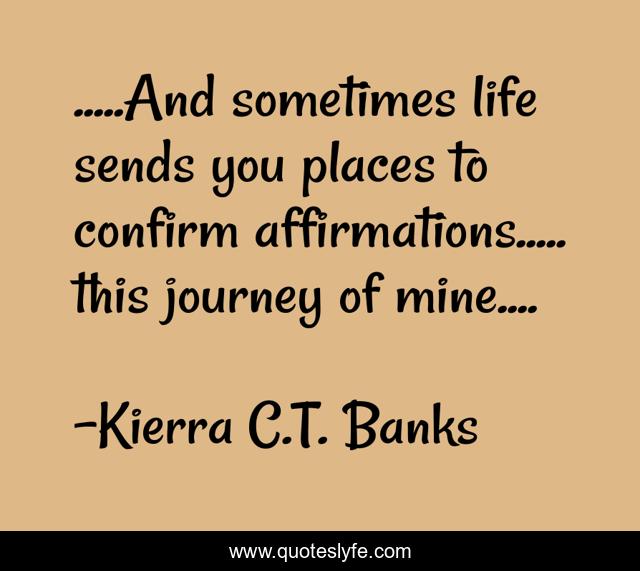 This page presents the quote ".....And sometimes life sends you places to confirm affirmations..... this journey of mine....". Author of this quote is Kierra C.T. Banks. This quote is about life, confirmation, quotes, mantra, new-chapter, affirmation, perspective, life-lessons, journey,.