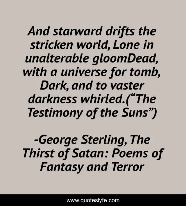 This page presents the quote "And starward drifts the stricken world, Lone in unalterable gloomDead, with a universe for tomb, Dark, and to vaster darkness whirled.(“The Testimony of the Suns”)". Author of this quote is George Sterling, The Thirst of Satan: Poems of Fantasy and Terror. This quote is about armageddon, death, darkness, apocalypse,.