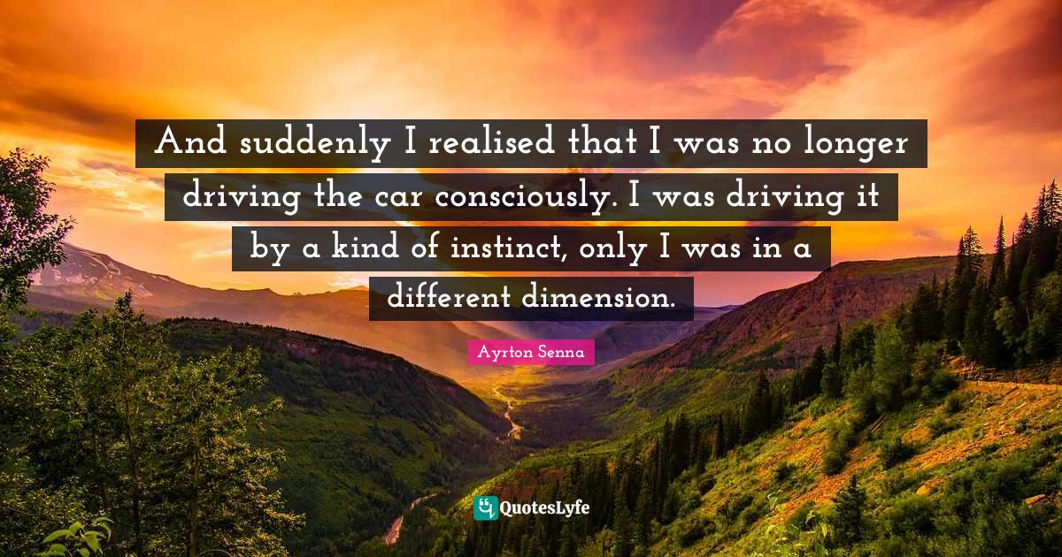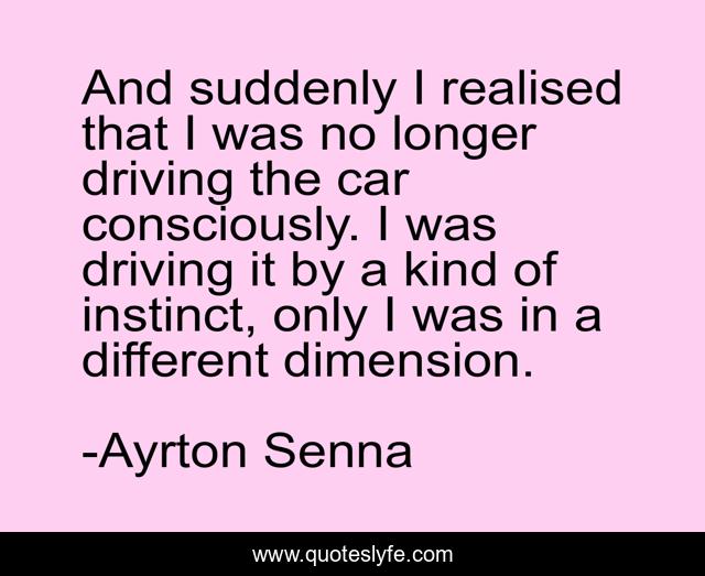 This page presents the quote "And suddenly I realised that I was no longer driving the car consciously. I was driving it by a kind of instinct, only I was in a different dimension.". Author of this quote is Ayrton Senna. This quote is about kind, different, driving,.