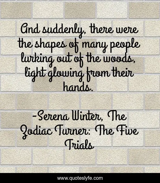 This page presents the quote "And suddenly, there were the shapes of many people lurking out of the woods, light glowing from their hands.". Author of this quote is Serena Winter, The Zodiac Turner: The Five Trials. This quote is about excitement, suspense, cliff-hanger,.