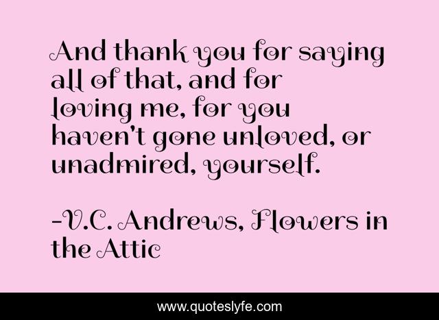 This page presents the quote "And thank you for saying all of that, and for loving me, for you haven't gone unloved, or unadmired, yourself.". Author of this quote is V.C. Andrews, Flowers in the Attic. This quote is about admired, admiration, love, unadmired, unloved, incest, thankfulness, affection, loving,.