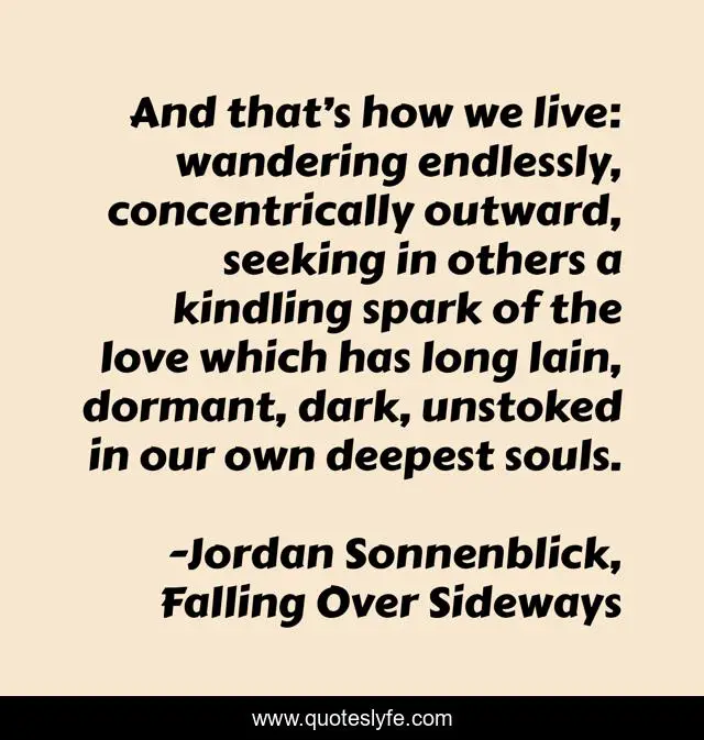 This page presents the quote "And that’s how we live: wandering endlessly, concentrically outward, seeking in others a kindling spark of the love which has long lain, dormant, dark, unstoked in our own deepest souls.". Author of this quote is Jordan Sonnenblick, Falling Over Sideways. This quote is about falling-over-sideways, deep, jordan-sonnenblick,.