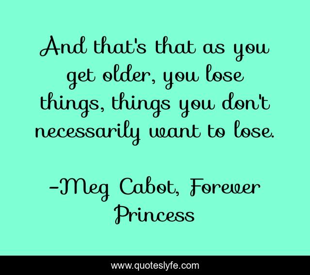 This page presents the quote "And that's that as you get older, you lose things, things you don't necessarily want to lose.". Author of this quote is Meg Cabot, Forever Princess. This quote is about loss, meg-cabot, life-lessons, princess-diaries,.