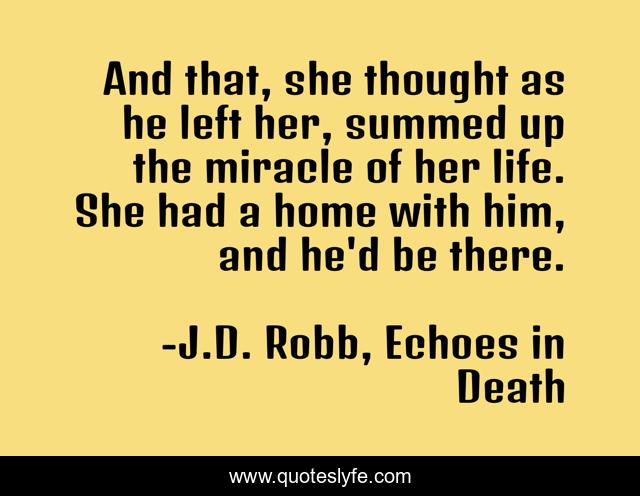 This page presents the quote "And that, she thought as he left her, summed up the miracle of her life. She had a home with him, and he'd be there.". Author of this quote is J.D. Robb, Echoes in Death. This quote is about home, miracle, roarke,.