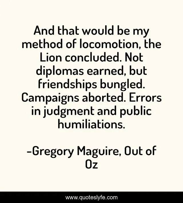 This page presents the quote "And that would be my method of locomotion, the Lion concluded. Not diplomas earned, but friendships bungled. Campaigns aborted. Errors in judgment and public humiliations.". Author of this quote is Gregory Maguire, Out of Oz. This quote is about humiliations, locomotion, life, journey,.