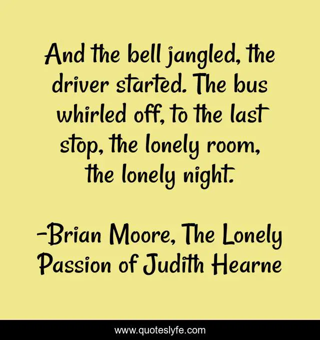 This page presents the quote "And the bell jangled, the driver started. The bus whirled off, to the last stop, the lonely room, the lonely night.". Author of this quote is Brian Moore, The Lonely Passion of Judith Hearne. This quote is about bus, loneliness, lonely,.