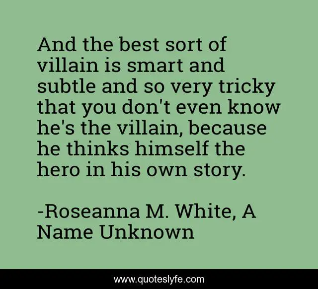 This page presents the quote "And the best sort of villain is smart and subtle and so very tricky that you don't even know he's the villain, because he thinks himself the hero in his own story.". Author of this quote is Roseanna M. White, A Name Unknown. This quote is about villain, hero, smart,.