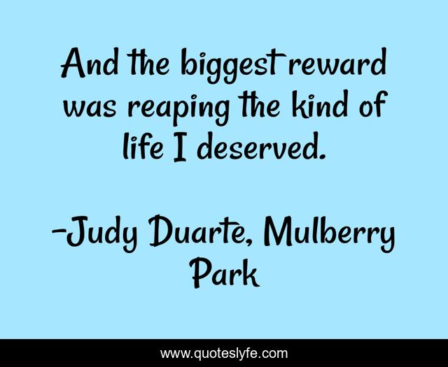 This page presents the quote "And the biggest reward was reaping the kind of life I deserved.". Author of this quote is Judy Duarte, Mulberry Park. This quote is about enthusiasm, life, inspirational,.
