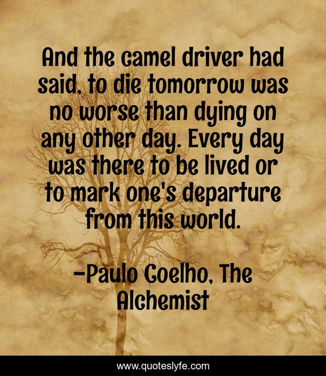 This page presents the quote "And the camel driver had said, to die tomorrow was no worse than dying on any other day. Every day was there to be lived or to mark one's departure from this world.". Author of this quote is Paulo Coelho, The Alchemist. .