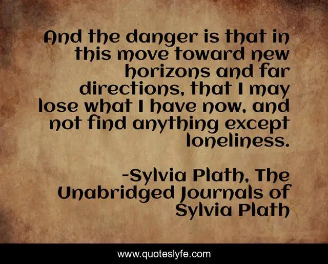 This page presents the quote "And the danger is that in this move toward new horizons and far directions, that I may lose what I have now, and not find anything except loneliness.". Author of this quote is Sylvia Plath, The Unabridged Journals of Sylvia Plath. This quote is about alone, moving, leaving,.