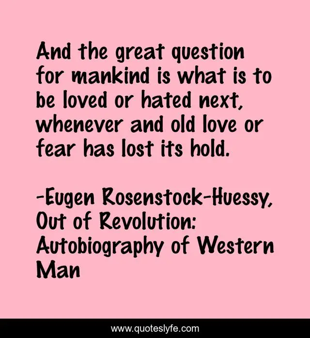 This page presents the quote "And the great question for mankind is what is to be loved or hated next, whenever and old love or fear has lost its hold.". Author of this quote is Eugen Rosenstock-Huessy, Out of Revolution: Autobiography of Western Man. This quote is about great-questions, fear, love, mankind, affection,.