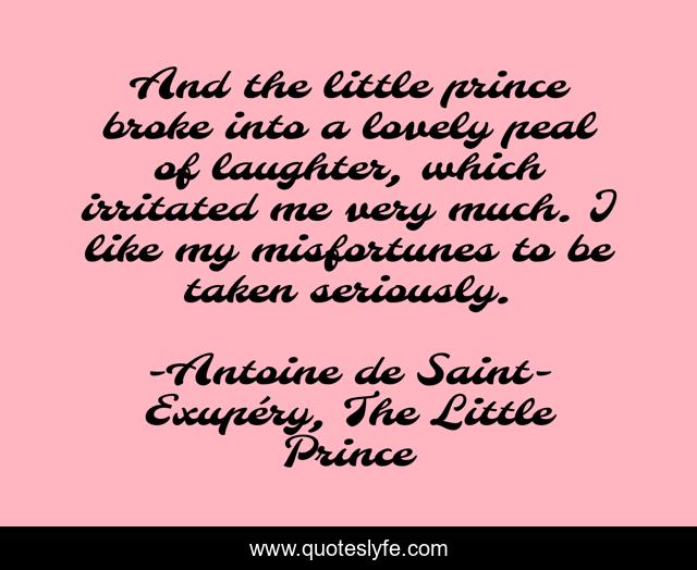 This page presents the quote "And the little prince broke into a lovely peal of laughter, which irritated me very much. I like my misfortunes to be taken seriously.". Author of this quote is Antoine de Saint-Exupéry, The Little Prince. This quote is about misfortunes, laughter,.