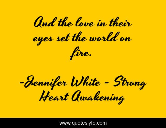 This page presents the quote "And the love in their eyes set the world on fire.". Author of this quote is Jennifer White - Strong Heart Awakening. This quote is about love, quotes, fire, soulmates, spirituality, twin-flame, happiness, affection,.