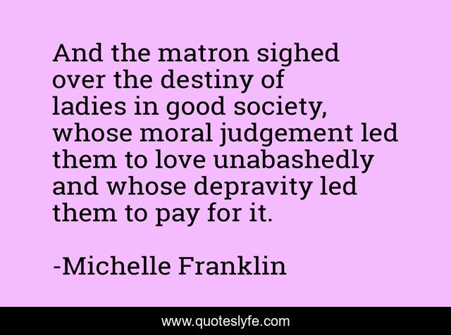 This page presents the quote "And the matron sighed over the destiny of ladies in good society, whose moral judgement led them to love unabashedly and whose depravity led them to pay for it.". Author of this quote is Michelle Franklin. This quote is about forbidden-love, love-hurts, love, affection, women,.