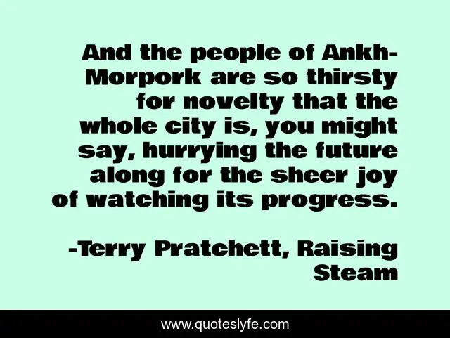 This page presents the quote "And the people of Ankh-Morpork are so thirsty for novelty that the whole city is, you might say, hurrying the future along for the sheer joy of watching its progress.". Author of this quote is Terry Pratchett, Raising Steam. This quote is about progress, future,.