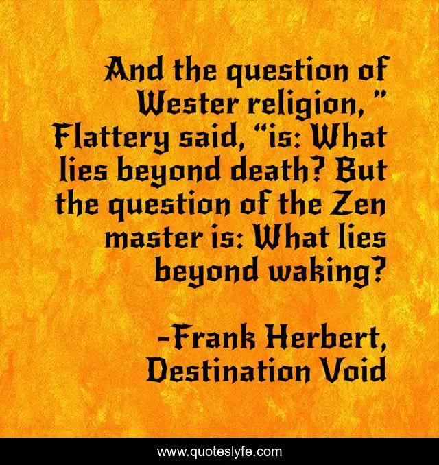 This page presents the quote "And the question of Wester religion, ” Flattery said, “is: What lies beyond death? But the question of the Zen master is: What lies beyond waking?". Author of this quote is Frank Herbert, Destination Void. .
