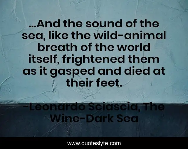 This page presents the quote "…And the sound of the sea, like the wild-animal breath of the world itself, frightened them as it gasped and died at their feet.". Author of this quote is Leonardo Sciascia, The Wine-Dark Sea. This quote is about italian-literature, sea, ocean,.