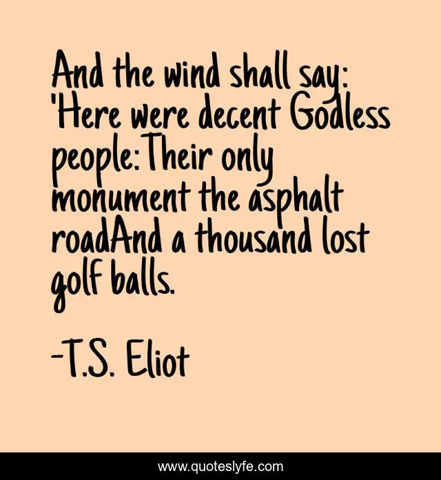 This page presents the quote "And the wind shall say: 'Here were decent Godless people:Their only monument the asphalt roadAnd a thousand lost golf balls.". Author of this quote is T.S. Eliot. This quote is about progress, modernity, individualism,.