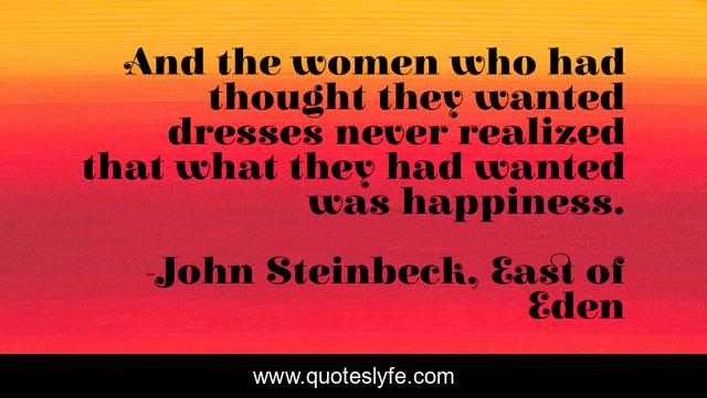 This page presents the quote "And the women who had thought they wanted dresses never realized that what they had wanted was happiness.". Author of this quote is John Steinbeck, East of Eden. This quote is about dresses, happiness, women,.