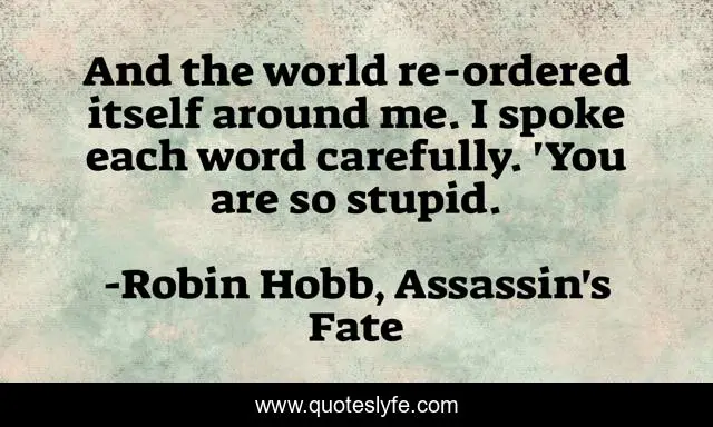 This page presents the quote "And the world re-ordered itself around me. I spoke each word carefully. 'You are so stupid.". Author of this quote is Robin Hobb, Assassin's Fate. This quote is about fool, sorrow, stupid, pain,.
