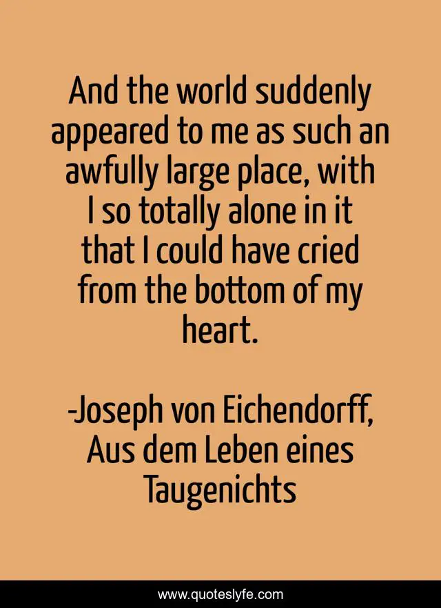 This page presents the quote "And the world suddenly appeared to me as such an awfully large place, with I so totally alone in it that I could have cried from the bottom of my heart.". Author of this quote is Joseph von Eichendorff, Aus dem Leben eines Taugenichts. This quote is about loneliness, despair, self-pity,.