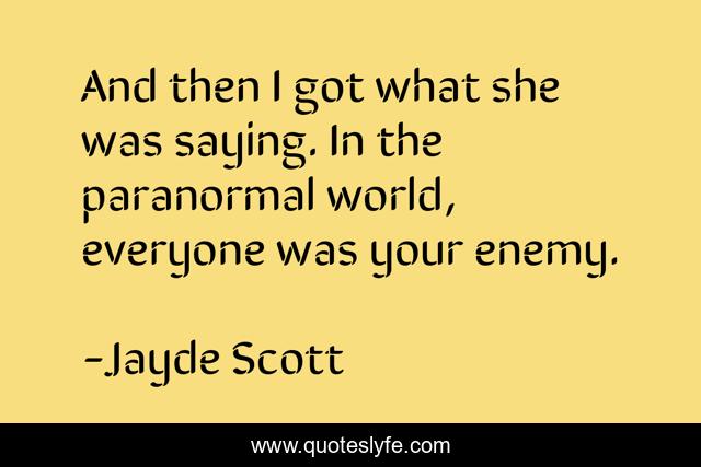 This page presents the quote "And then I got what she was saying. In the paranormal world, everyone was your enemy.". Author of this quote is Jayde Scott. This quote is about inspirational, paranormal, vampire, voodoo-kiss, jayde-scott, enthusiasm,.